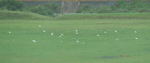 假日,這裡有的是騎車的、散步的、打球的、遛狗的.....而今都躲進屋裡去了,偌大的堤外球場就留給小白鷺吧!