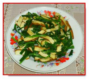 3.再放少許油炒韭菜,韭菜快熟時,加入炒好的豆乾絲,即可。