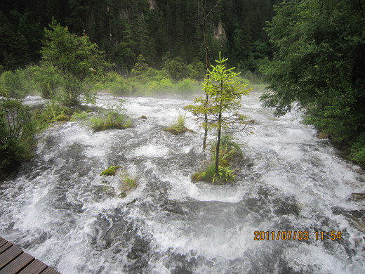 天空下著雨,有人抱怨著,我卻心中慶幸能在這樣的天氣遊九寨溝~整座山被雲霧包圍著,在虛無縹渺間一切是那麼的美,又增添了幾分神祕感。我拿著相機貪婪的捕捉美麗鏡頭,深怕遺漏掉。珍珠灘~水流過河床激起的水花就像是珍珠般顆顆晶瑩剔透,美如其名!樹正群海~一整片的瀑布群由上傾洩而下,水勢壯觀,驚心動魄,美麗極了!諾日朗群海~大大小小的瀑布,令人目不暇給。此地哪是一個「美」字能形容!