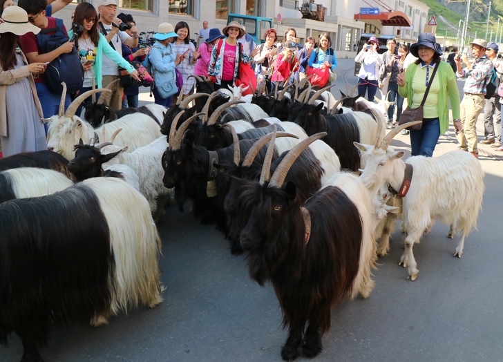 遇上驅趕這羊群回家的牧羊女,穿傳統服裝,顯然是為吸引觀光客舉辦的活動