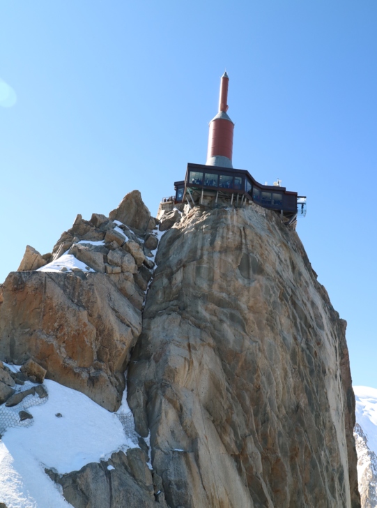 南針峰峰頂是由南北兩個高聳的堅硬石塊所構成,稱為北峰與主峰,兩峰之間透過中央天橋相連。纜車車站建於較低的北峰,必須爬三層樓高的階梯才能上「霞慕尼觀景平台」。經過中央天橋,可到達主峰入口。主峰內有電梯將遊客送上南針峰最高點的「中央觀景台平台」。在中央觀景台還有一個在2013年才開放的新景點「空中盒子」。空中盒子是四面和底面都由玻璃製作的透明觀景台,進入後彷彿踏入宇宙虛無,可惜排隊人潮太多,相機須交給工作人員拍攝。因背景太亮,工作人員技術也不怎樣,所以效果並不好。不過無論站在北峰的霞慕尼觀景平台」,還是主峰的「中央觀景台平台」,都可看到將近3600的壯觀視野。除了渾圓碩大的白朗峰就在眼前外,連綿的雲海與崢嶸的阿爾卑斯山系,還有渺小卻勇敢的稜線登山客,看了實在令人震撼。