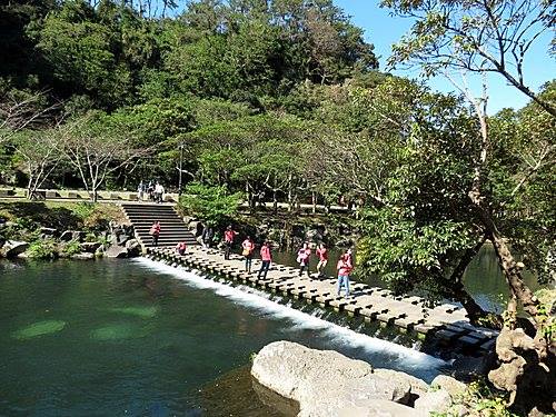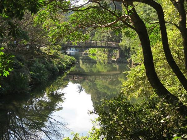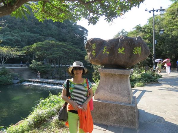 天地淵瀑布地標,後方有石階步道過溪到對岸