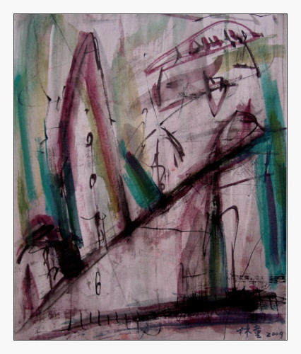 一個脫掉西裝的男人;一位裸體的女人;一艘待揚的船;一段未完成想像的人生;偶留的白及不經意的綠;方框侷限著尖銳的三角;空間滿載。
