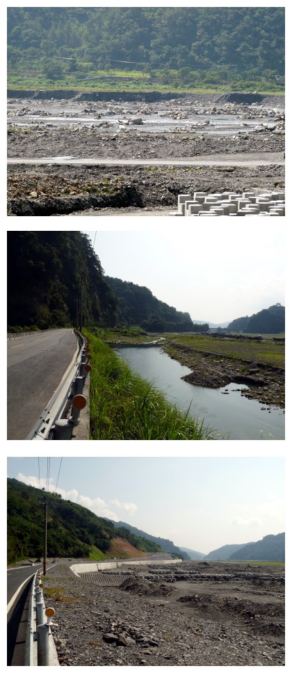 照片中的這一場景真的是很跨張,跨張到讓我懷疑這樣的行為到底是否合理?一路往中上游走,更是發覺那河旁的山坡更是坍塌的利害,可是在另些河床的做法就保守多了。