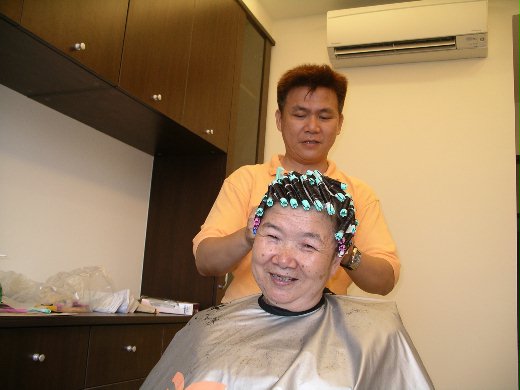 原來這時--他正在另一個房間幫媽媽燙頭髮....