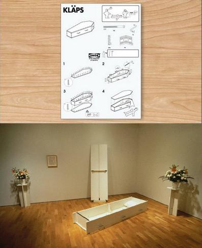 做完凱莉包還不過癮,建議可挑戰進階版DIY,同樣秉持節約但仍要有型的精神,來自美國藝術家Joe Scanlan對死亡議題最露骨的創意,附有模仿IKEA的瑞典文組裝說明書,按步驟製作,最後可得棺材一口,及兩個放花的架子,真的非常貼心。