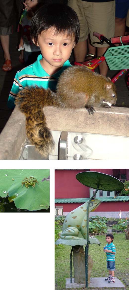 有一隻松鼠在吃東西,我靠得好近好近,牠都不怕我,我說可不可以摸一下,旁邊的別人都說不要,說會被咬到,可是牠很可愛啊!問拔巴可不可以把牠帶回來?拔巴也說不可以!