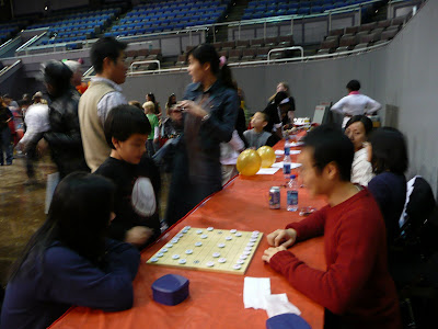 算了,不說去年的事了,講講今年的活動吧!嘿嘿,順道一提,今年就沒有國旗繞場的節目了,我想是因為奧運已經辦過了,對岸不用再為奧運宣傳,當然也就不想理我們這個南方破鎮的辦的活動囉!(這是我的個人想法啦!哈哈!) 我們今年雖然還是雇一樣的攤位,不過感覺上比去年有更多的人來看,我和大狗示範下象棋給外國人看,順便解說象棋的規則,原來要用英文解釋怎麼下象棋還真不容易呢!