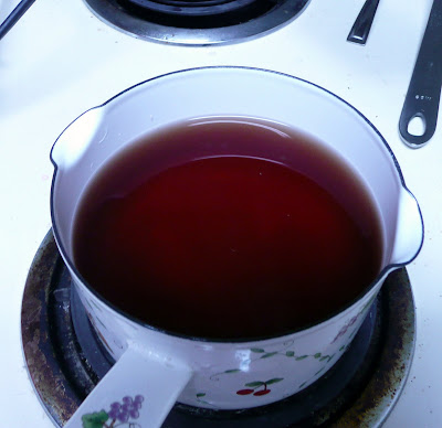 先煮一種Blush,加入泡開的吉利丁,倒入一些到杯子裡當底層,然後放入冰箱約兩個小時,等果凍已經凝結好了,就放入一些你喜歡的水果,我用的是綜合的罐頭水果。