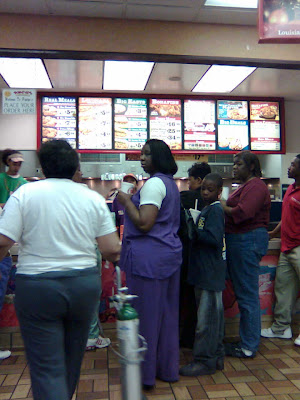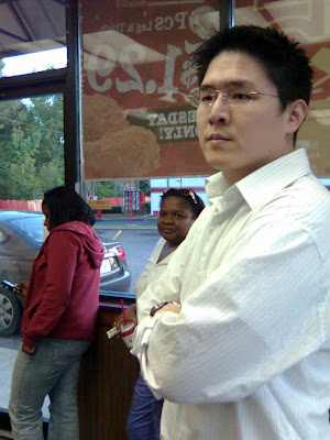 ........我們非常識相的問了一下隊尾在哪裡,就乖乖的當起排隊買炸雞的一員,這時,我們猛然一回頭,竟然發現整間店只有我們兩個亞洲人耶!!! 我們被黑ㄇㄧㄚㄇㄧㄚ的老黑給包圍住了!!!! 頓時,只見我和大狗兩個面面苦笑了一下.....呵....呵....呵.....