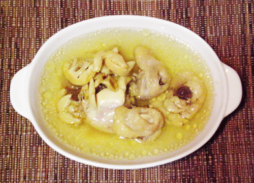鍋內放入雞腿塊、巴西蘑菇、老薑,還有清水,利用燉鍋,30分鐘的燉煮,再燜10分鐘讓生命沉澱一下。起鍋前灑下一些些鹽調味,只要鹽巴,其他的調味都是多餘,這就是鮮美的蘑菇雞湯了。