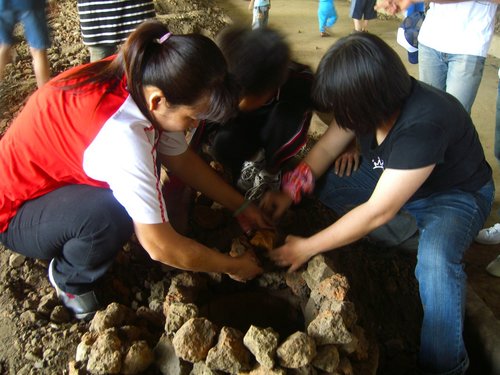 將土窯敲平埋住食物、歷經2小時後才可以挖出、等到挖出雞肉、地瓜、雞蛋時一陣歡呼、全部的等待、辛苦都拋到腦後、盡情享受人間美味。