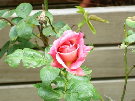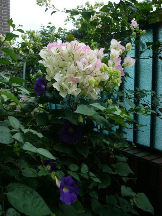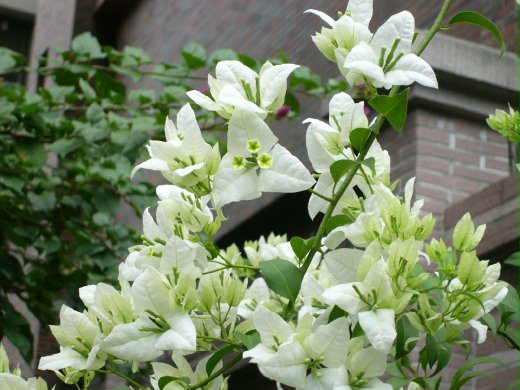 只長葉子不開花的桃紅色九重葛也開竅了,