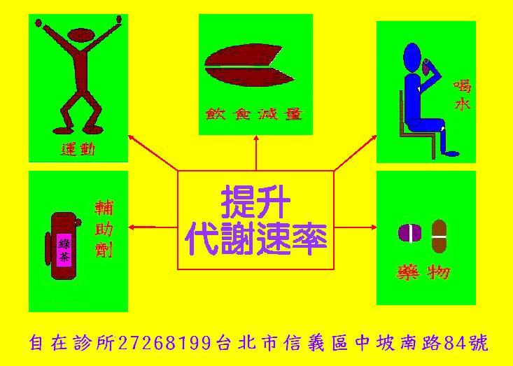 運動:運動直接增加代謝速率是無庸置疑。運動是直接能量的消耗,可以改善體內胰島素的功能,對代謝都有正面的意義。一般建議,每週運動五到七天、每次至少持續卅分鐘、維持一定的運動強度。運動的目的是在增進代謝的速率,運動的選擇以有氧運動為主。有研究指出,不只運動時可以加速代謝的能力,運動結束之後的休息,體內的代謝速率也比不運動的人來得快。