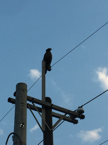 大冠鷲似乎侵入了烏鶖的領域,鏡頭外的母鳥振翅揮趕,它兀自傲立電桿,不為所動