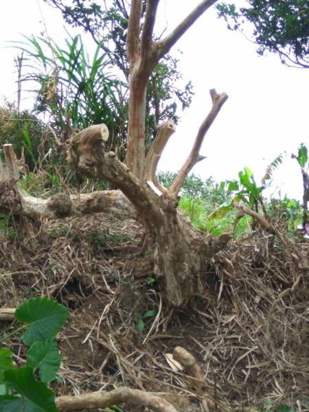 果不其然,識貨者動手了,先是鋸短旁支,再把淺根刨掉,作勢要挖走這棵九芎,九芎何辜,長在小坡上數十年,遭誰惹誰,卻因為我暴露了它的隱身處而遭罪。看了心疼,除了到警察機關備案,也在樹幹掛上「警告毀損」的告示,希望遏止宵小的貪婪。