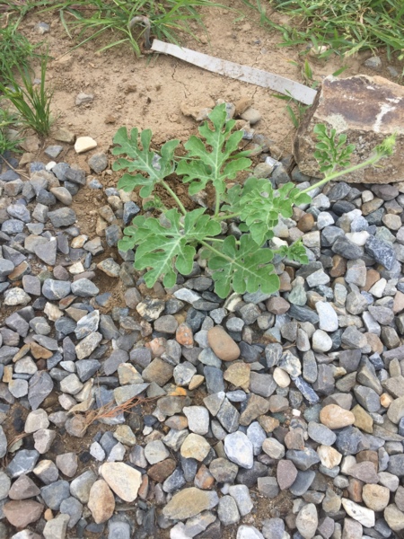 玩伴眼尖,一眼看到一株西瓜苗堂而皇之的長在走道邊,四肢伸展,仿如剛起床的小娃兒,還在試探週邊世界是不是友善?沒有天上掉餡餅的事,八成是前陣子哪位吃瓜掉籽的成果,靜觀後果,是,說不定真結果呢