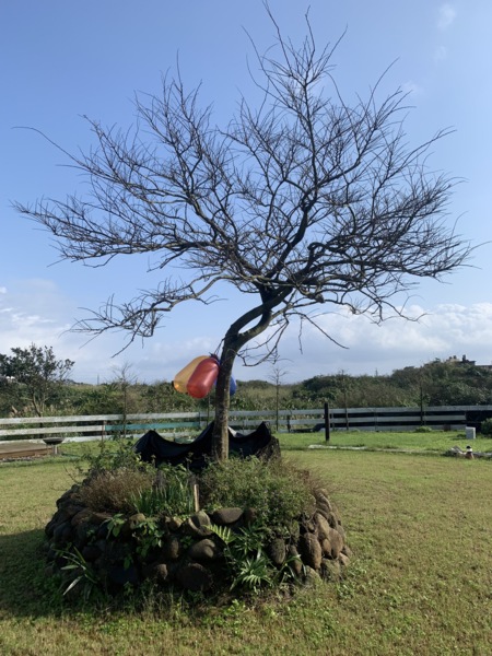 第二名,常見,顯眼,數量眾多,至今沒有更好利用方式的垃圾,就頒給「浮球」吧,漁民使用的浮球,各異其趣,圓形、橢圓形、透明、不透明,再加上紅、橙、黃、藍、灰,兼而有之,倒是為這片暗沈沈,灰撲撲的海岸,增添色彩,帶來不少生氣。不同時間,撿了澄、紅、藍三色浮球,掛在顯眼處,美其名叫「裝置藝術」,天知道,哪天,海嘯淹到朴樹這麼高時,正好作為逃生工具。