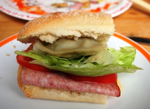 突發奇想就把餃子放到拖鞋麵包作的三明治裡了,有聽過炒麵麵包,還沒聽過煎餃麵包吧 ! :D