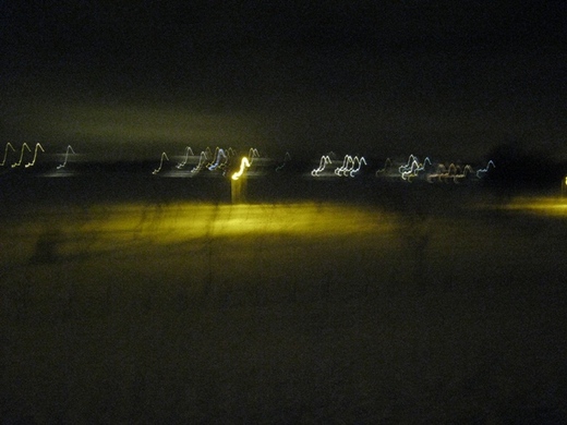 道別時已經是半夜了, 走在河堤上黑暗已經取代了雪白, 只有遠方的小路上的黃色路燈微微的發亮, 沒有腳架的話, 是很難拍出能看的照片, 不管怎樣我還是按了快門. 即便是一張有瑕疪的照片, 但是變形的燈光像是音符一樣, 還是放了上來:)