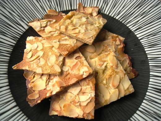 一般的作法是在麵糊拌好後,以這個配方,大約是把150克的杏仁片加到麵糊裡拌勻,然後再把全部粘成一糰的杏仁麵糊用湯匙一坨坨的想攤平在烤墊上,要儘量別讓杏仁片重疊,但這真的是蠻耗工而且很難作到,所以我乾脆分開處理,先把麵糊倒入,再灑上杏仁片(杏仁片的用量可以少很多,當然如果很喜歡杏仁,可以自己多加也不是問題),我想唯一的差別再於,如果一開使就拌入杏仁片,那杏仁片會被沾滿麵糊,烤出來杏仁片上也會有麵糊。