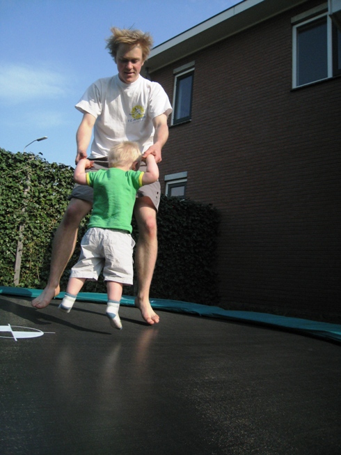 今年的4月24及25日是復活節, 之前在歐洲時也有遇到復活節, 不過那時對復活節的想法也只不過是假期而已, 今年的復活節是跟J的家人一起度過, 荷蘭天氣正好, 我跟J週六搭了九點的火車先去J二姐的家幫忙他們掘一個大坑, 他們買了一個超大的彈跳網, 放在他們超大的花園裡, J二姐的老公從星期五早上就開時挖那個大洞(很大, 成品就像是太空殞石撞了一個大洞一樣), J從星期六開始幫忙, 一直到下午四點多洞終於挖好, 開始其他裝置, 安裝完成後, 也已經五點多了, 我從來沒有玩過這樣的跳跳網(我不知道中文是什麼XD), J和J姐倒是不陌生, J二姐因為有孕在身, 不敢跳的太高, 我第一次玩, 沒想到還蠻有運動效果的。