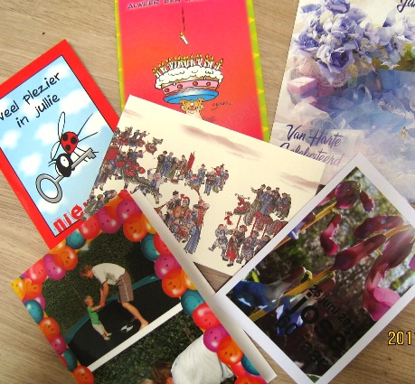 荷蘭人除了逢年過節會寄卡片給親友(真的是眾親朋好友喔,父母兄弟姐妹,姪子女,外甥女,奶媽,奶媽過去照顧的小孩都寄)外,每逢誰搬家,生日,生小孩,高中畢業,大學畢業...都要寄卡片,不然就寄簡訊),J媽是一個很喜歡講電話還有跟親友連繫的人,除了一週可以大小事都打電話跟所有小孩聊外,還會特別打電話或是寄Email提醒小孩說:某某表弟大學畢業了,記得傳簡訊去祝賀,誰高中畢業了,也要去祝賀,前一陣子我們剛搬到新公寓,正好J也在搬家不久後過生日,然後我們就收到了來自他姐姐們還有奶媽寄的生日卡片,除此之外,還收到姐姐們寄來恭賀搬進新家的卡片,我實在很不解的問J說,明明你生日跟我們搬新家的日子就很近,為何不只寄一張賀卡祝賀你生日然後一起提到新公寓就好了呢? 這個問題其實無解,反正他們要寄幾張就寄幾張好了XD(所以我們就在連續幾天收到大姐二姐的好幾張卡片,卡片要分開買,郵資也要另外付,一些卡片還是客製化的XD)。
