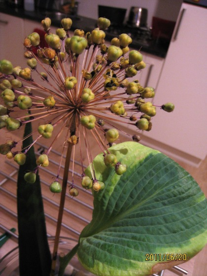 今天突然發現桌上的Allium除了漸漸凋零,但是卻冒出一顆顆原本被包覆住的種子了!突然有一種 Circle of Life 的感動! Allium是一種我很愛的花,不知道種子直接拿去種會不會發芽,或許可以隱藏在卡片裡面寄給大姐,送給對植物很有研究的姐夫。