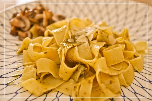 5. 淋上松露油,要吃之前將麵拌一下讓所有的麵條都沾有青醬,起士以及松露油的美味。我炒了一些磨菇來吃(多吃蔬菜好!)