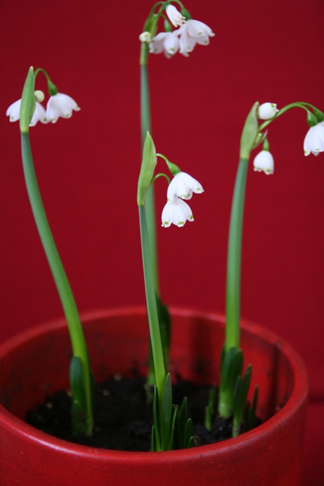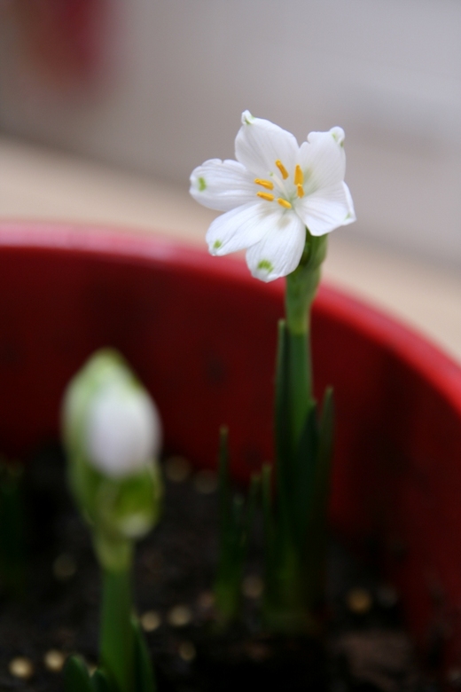今年秋末在花園裡種下了各類Allium, 鬱金香,水仙,Galanthus等球莖植物,種下對春天的期盼,也算是在我們之後住到一個有真正花園的房子前的練習。或許是供應商有對球莖進行催熟的程序,秋天時種植的Galanthus在二天前默默的開了第一朵花,我放了四個球莖在花盆裡,因為放在室外怕下雨積水,前一陣子移到了室內,可能是因為室內較溫暖的關係,這四顆球莖生長的速度快了一些,率先開了第一朵小花!晚上時被我發現,好興奮!(現四顆球莖都開花了),正好花盆是紅色的,成為了我們的聖誕應景花卉:)