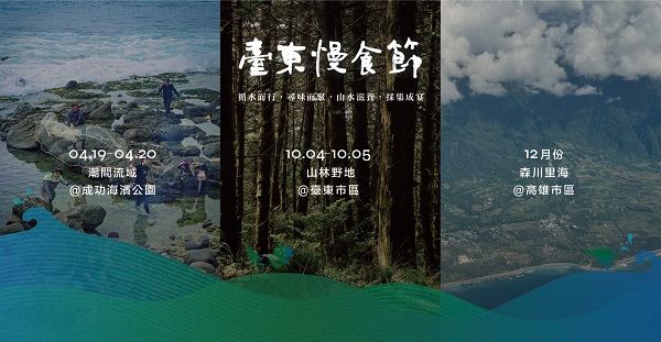 今年台東年度慢食之旅,預計舉辦三場「採集餐桌」活動,首場為「潮間流域篇」,訂於4/204/21 的11:00-17:00於成功海濱公園登場;第二場於10/4-10/5舉行,鎖定台東市區的山林野地美食;第三場12月移師高雄市區以森川里海為採集主題。
