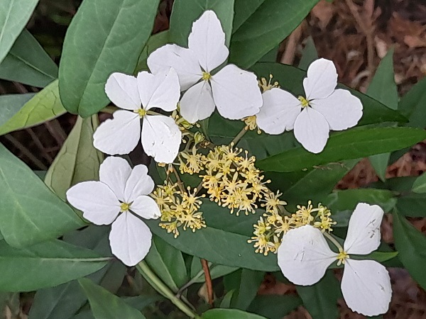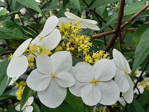 先說一下華八仙神奇的雪白花朵,它為此株帶來不同凡響的美貌,民眾走在近郊山林步道,很難不被滿開白花黃蕊的花叢吸引,尤其春風吹過花朵如蝶翩翩飛舞。其實華八仙是植物界的詐欺高手,它引人的白花瓣竟非其真花,而是瓣狀無性花,沒有孕育下一代功能,反倒是不起眼的小黃花才是真花。