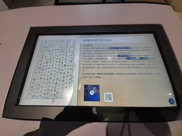 第二陳列廳則以「歲月沉思錄」為主題,在此可見蔣經國的書畫作品、日記,以及侍從和部屬眼中的經國先生,同時以數位影像搭配實體物件來展示。珍貴的是,現場可見蔣經國的手寫日記(複本),字跡工整優美。