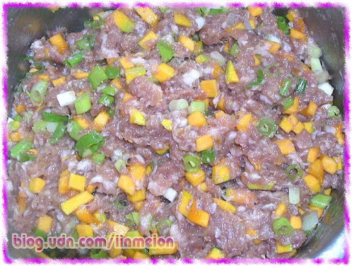 絞肉加入鹽,先拌到有黏性,再加入其他調味料及南瓜丁一起拌勻,