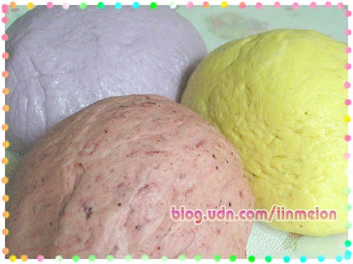 麵粉總用量700克,分別用南瓜泥、紅麴粉、芋頭泥揉成三色麵糰