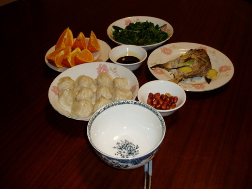 相片是本人用沸水旺火蒸五分鐘的成果及豐盛的晚餐(青菜、魚、花生米、水菓、南翔小籠 )。