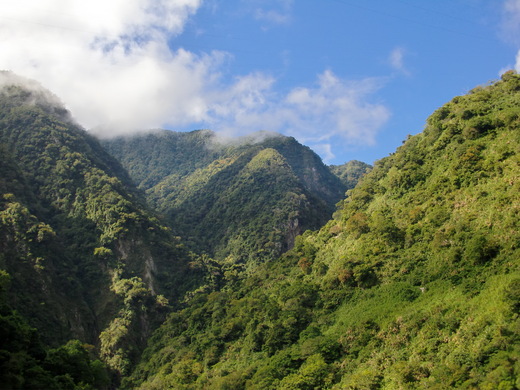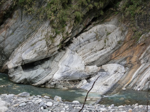 太魯閣族人走的是能高越嶺古道,我們(坐車上山,)只能遠眺能高飛瀑(又稱夫妻瀑布)的壯觀,大理石區裡奇岩異石,七分相三分憑想像,如王建民遺留的手套,台灣山羊親美人,紅毛猩猩戲猴子,猴子丟白菜,K到獅子頭,唉啊!甩下三層肉,生氣而怒吼,讓山崖上的猫頭鷹盯著笑呵呵!