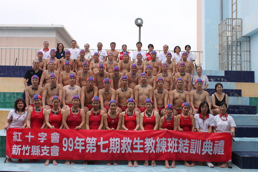 水上救生綜合演練前,教練下口令伏地挺身(一下二上)做二十下,緊接著平跳入水,潛泳,由泳池另一側上岸;再以跨步入水,抬頭捷泳前進至消波線,弓身下潛回原出發點上岸。
