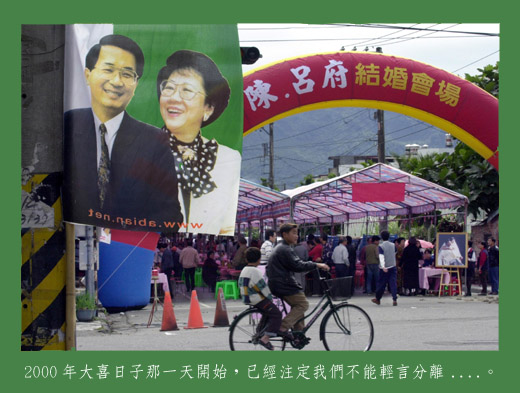 哇!說遠了!我要談的是,政治人物的攝影,也可以輕鬆拍啦!2000年大選,我跟著候選人南北奔波貼身採訪。趕路中,在花蓮鄉下見到陳、呂府聯姻喜宴,路旁電線杆上的競選旗幟好似新人一對,本來我車子已飛嘯而過,見這莞爾一幕不覺又回頭留下這張照片。那一年,陳呂也成為總統府新人。我只覺得拍這張照片時好好玩!