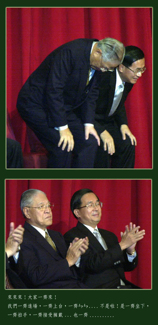 至於國家元首的玉照,不敢妄加批評,以免落得詆毀國家元首的罪名,拍是拍了,大家各有解讀,岩里正男桑(李老先生喜歡人家用日本名字稱呼他)的是下巴往上一推,往往給人一種不屑的感覺,從來沒有看過他謙虛的表情,至於陳水扁總統(他沒有日本名字,所以還是用中國姓,啊,不對,他喜歡塑造親民形象,還是叫阿扁好了),他的的笑容永遠都讓人感覺到虛偽,笑臉藏刀,『聽說』連宋兩位主席都和滿臉笑嘻嘻的阿扁見面,結束之後又爆求官、又是爆宋陳密會,好像也說遠了!