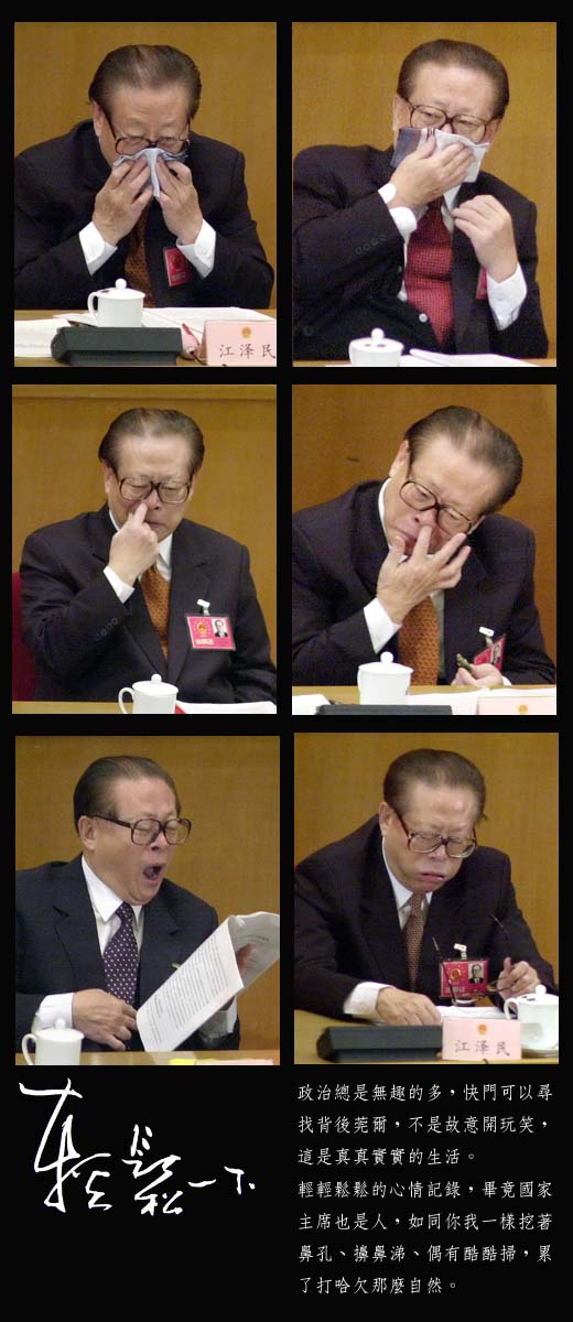 有一次在北京人民大會堂上,採訪一年一度的人大、政協會議,記得那天議程相當枯燥,不管與會的領導,或列席的高幹到採訪的記者,可以感覺大家都很累也很無聊,哈欠聲從台上到台下依稀可「聽」到。遠從台北到北京採訪,我總得應付發稿,於是我把焦點擺在大陸國家主席江澤民身上,看他在這一個沒有重大議題的下午,出現的各種表情。畢竟大陸採訪新聞環境與台灣大相逕庭,每當我相機快門聲響起,我就發現身旁邊的大陸記者,紛紛趕快把手離開相機,免得被誤會故意拍攝國家領導人的窘態,還有人直問我拍這個畫面作啥?我說好玩啊!一個老人家為國事如此操勞,也是正面。政治輕鬆一下又何妨?