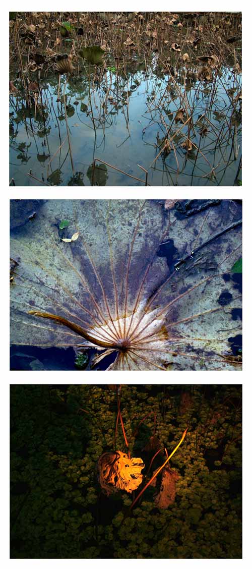 在熱鬧的花季後,荷塘一夜之間變得孤寂,然後風開始轉彎,開始有了涼意,所有春天抽出水面的荷身,在花開放、蓮子飽實結果後,不再汲取營養顧自老去。輝煌季節過後的寂寥,在人來人往花團裡,孤伶滲著最後美麗身影。