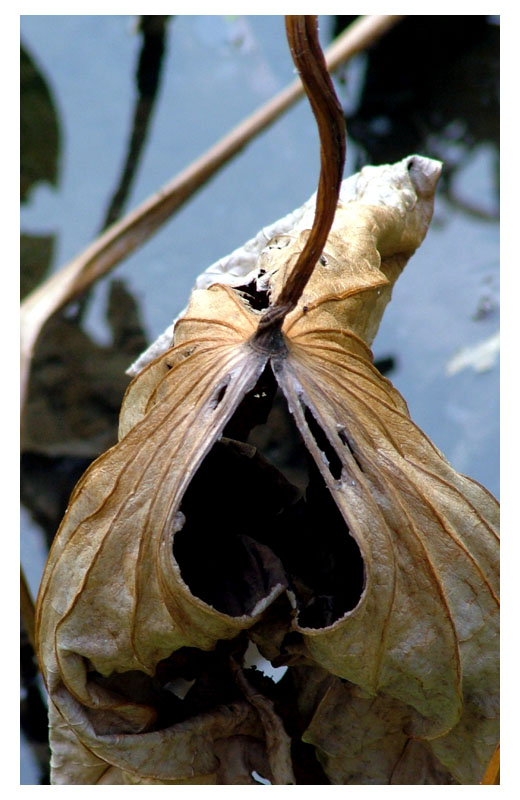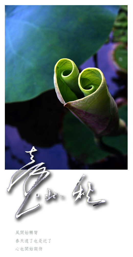 乾枯彎下的葉子,無意中自然扭曲成「心」的影子,為自己做結束。意外搶著秋天冒出新荷葉,在秋風裡也含蓄捲出「心」的開始,它也將孤獨度過長長的寒水。明年春天才有的新綠,偶見的一株意外,看見「心」的結束,也看見「心」開始。