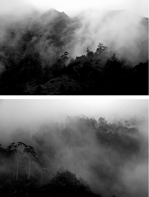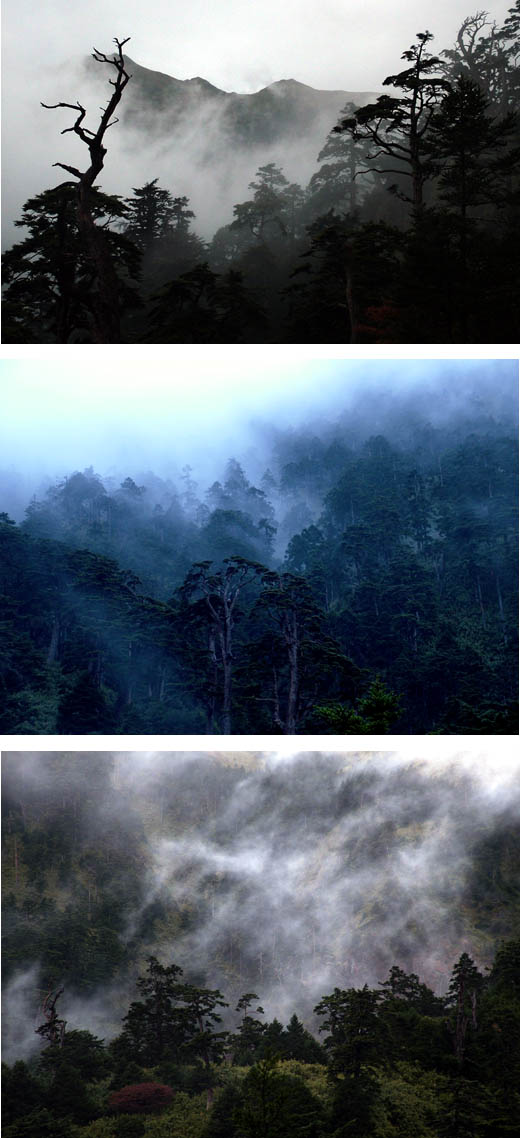 登山,一向重在過程路上賞心悅目,重在過程艱辛自我挑戰,而不在為征服山頭莽撞上攀,在一片白茫茫霧雲裡行走,二十公尺外已依稀,像走出一面白牆又走入一張白紙。此行雖無法完成既定,想想,偶一不能自主的停留也是幸福。眼前山景像是一紙全開打濕的宣紙,我見雲霧在上面潑墨發揮。