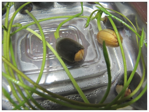剪開成熟蓮子仰天的另一端硬殼,像這時節的氣候,浸水兩三天,就會開始長出芽來。但也有極少數蓮子的胚芽,不在我們一般判斷的這一頭,而卻從剪開的另一頭長出芽來,算是少數胚芽錯位的例子。有點像是人的胎位錯置地掙長了出來。因此比其他蓮子的長芽會慢了一些!