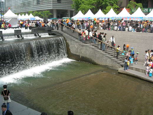 清溪川曾經是一條充滿垃圾及癈水汙染的河川,一九五O年代末期,韓國政府為了解決都市裡這條髒兮兮河川的問題,採用「覆蓋」工程法,在上面蓋起高架橋道路。在二OO三年七月,韓國政府決定用更環保的方式解決環境汙染問題,於是為清溪川進行復原整治工程,使這條古圳重見天日,而且成為首爾市民假日休憩的好去處。