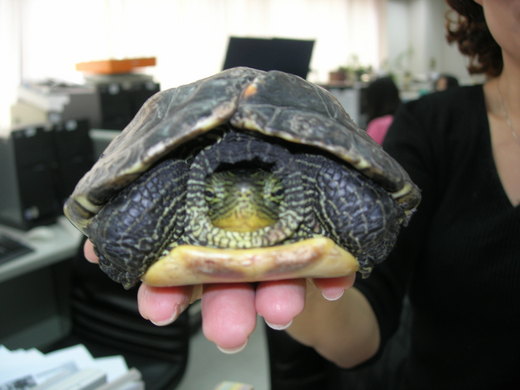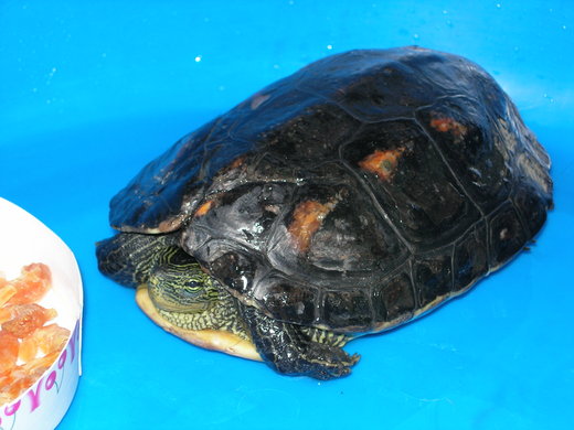 我們查了資料以後,才知道這兩種烏龜我們在夜市裡讓小朋友撈魚的地方,其實常常看到,但是體形都很小,看起來都很可愛。但是長到像阿薇帶回來的這隻差不多像「兩個手掌併攏靠在一起」這麼大的傢伙時,兩個個性就差很多了。「臺灣斑龜」還是好脾氣,不會攻擊碰到牠的東西。「巴西烏龜」就一點也不討喜,個性凶悍不說,樣子可怕到保證你連摸都不想摸牠一下。