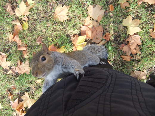 英國人應該相當愛護動物,海德公園的松鼠、灰鵝、海鷗和鴿子都天真、魯莽得可愛。松鼠見了我,立起身子打躬作揖,看到我動了心伸手在提包裡翻找早餐的剩麵包時,竟然等不及的爬到我身上,探著頭進提包裡跟我一起找了起來,親熱得像我養的寵物。