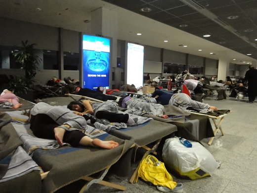 機場大廳入夜後很冷,大廳裡的躺床一張接著一張,這時也不分男女和各色人種了,占得到床位當夜就在那裡歇息。躺床區集中放置的位置離「最近的廁所」要走十分多鐘。中途離開的人會陷入要保行李還是保床位的猶豫。