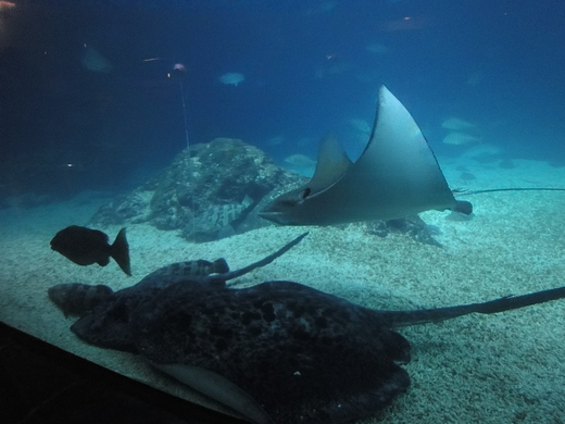 我很滿意我們選擇夜宿的「臺灣水域館」,當中有一座龐大的橢圓形展示缸,裡面可以容納一百萬加崙的海水,很擬真的呈現出寧靜湛藍的大洋,巨大的鯨鯊、魟魚就在眼前優游。夜晚的參觀沒有「人群移動」的壓力,你愛看多久,就可以看多久。